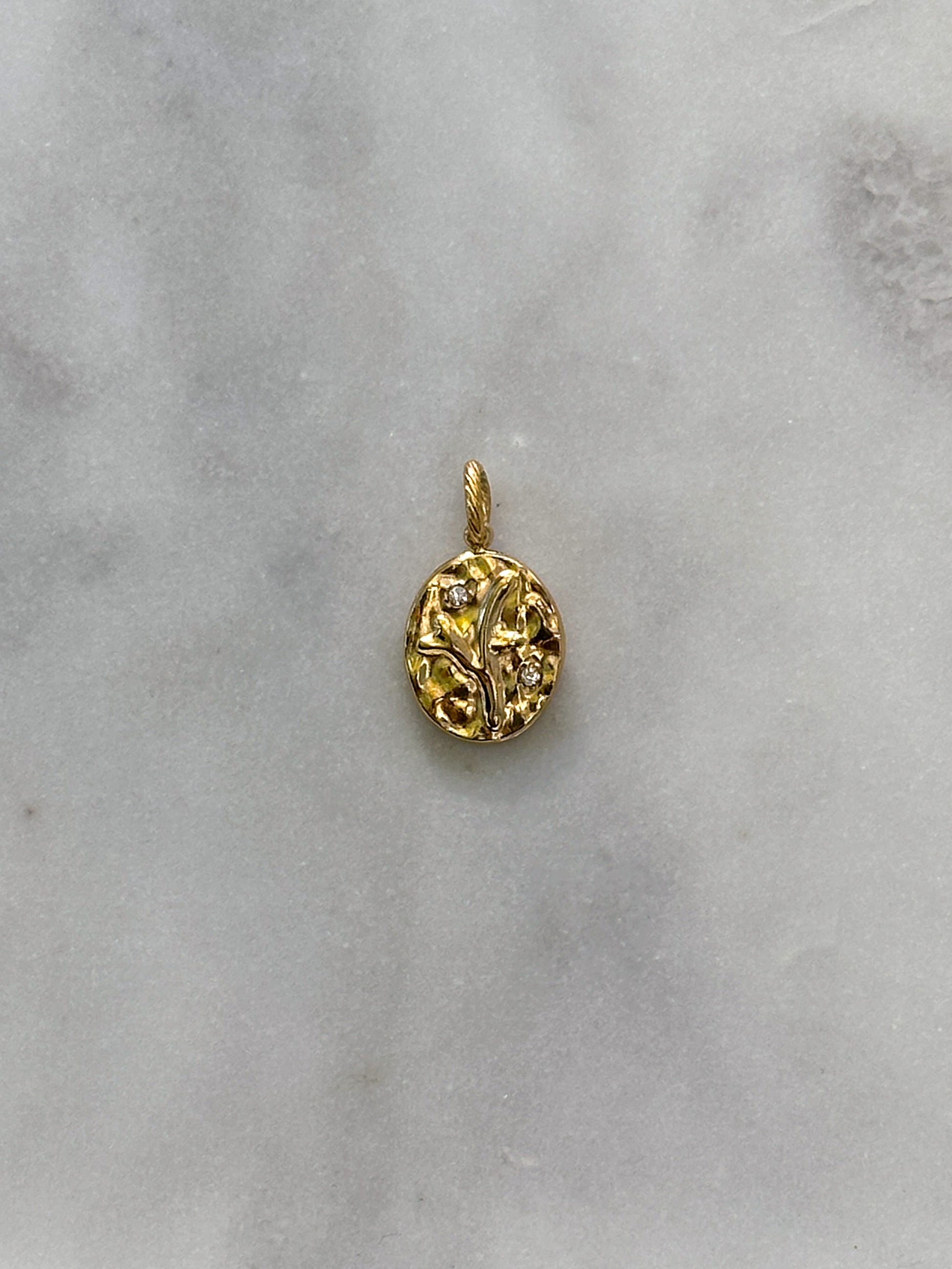 Textured oval pendant with a branch and clear rhinestones. Slip it on our Simple Link Chain and wear it alone as a single pendant or mix and match with other charms.
